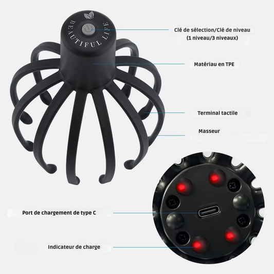 Brosse massage cuir chevelu pieuvre en acier inoxydable – Masseur de tête relaxant anti-démangeaisons