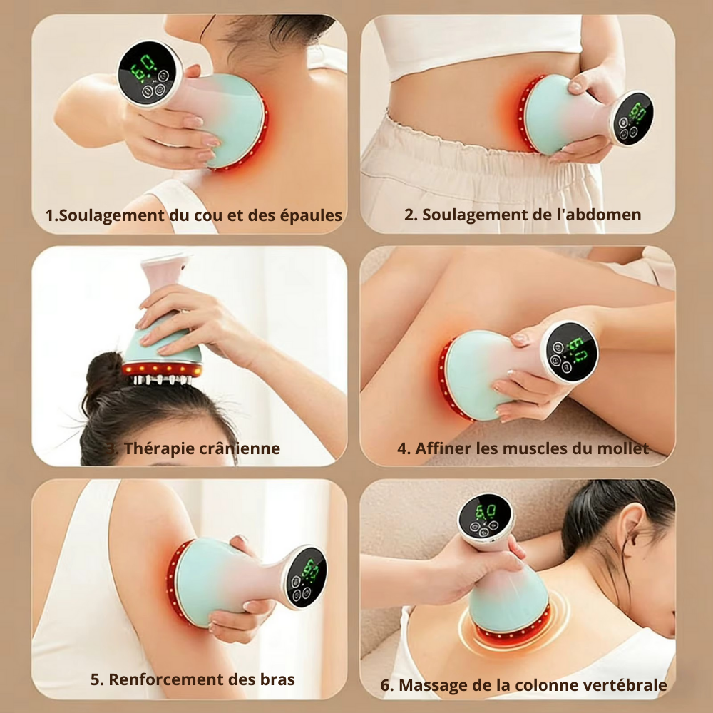 Pensé pour la relaxation corporelle, cet outil de Gua Sha corporel associe micro-vibrations et chaleur réglable pour agir sur les tensions profondes.